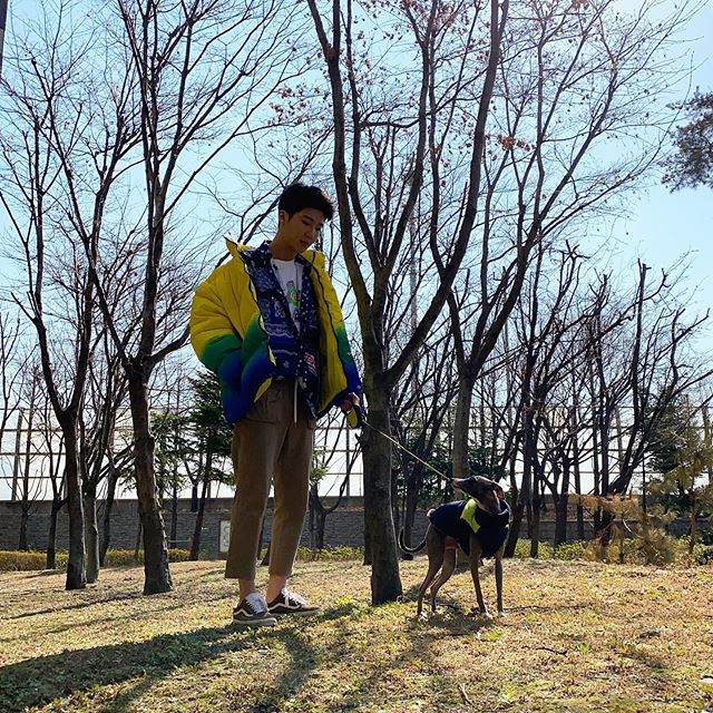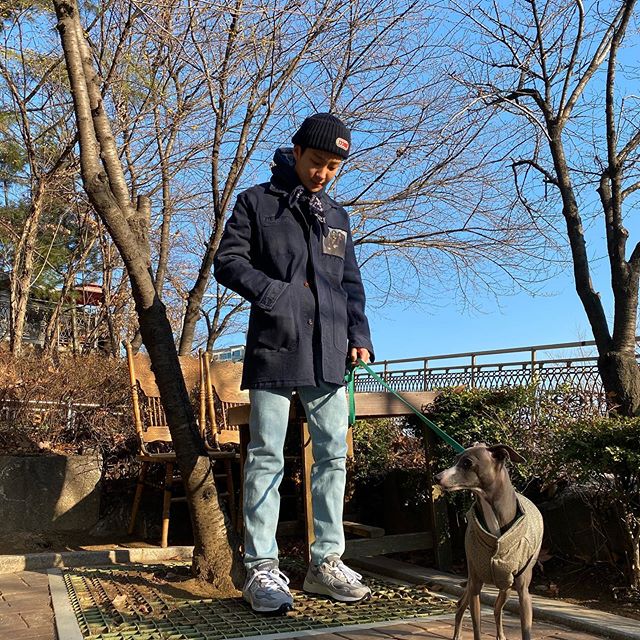 이승훈은 애완견과 산책하면서 찍은 사진이 많다.
