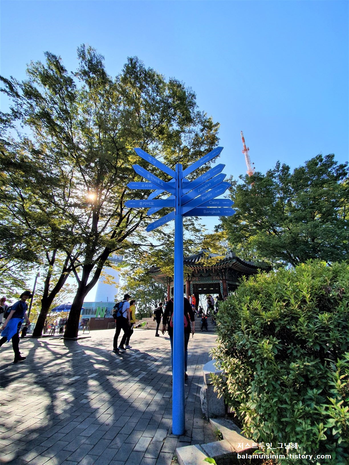 남산봉수대를 지나 팔각정 앞의 거리 팻말이 서있고 바로 남산타워가 보인다.