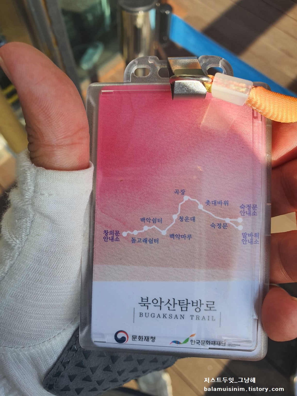 북악산 탐방로를 통과하려면 말바위 안내소에서 입장 카드를 목에 걸고 북악산을 넘어서 창의문 안내소에서 반납을