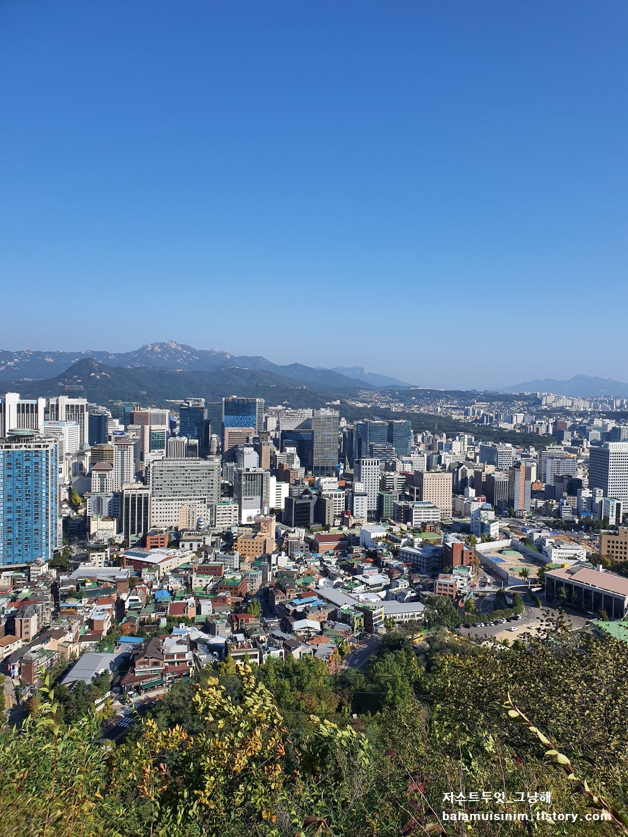 북악산에서 바라본 남산이 도저히 믿기지 않는 게, 아침에 우리가 서 있었던 곳이라고 생각하니 아득하게만 보인다.
