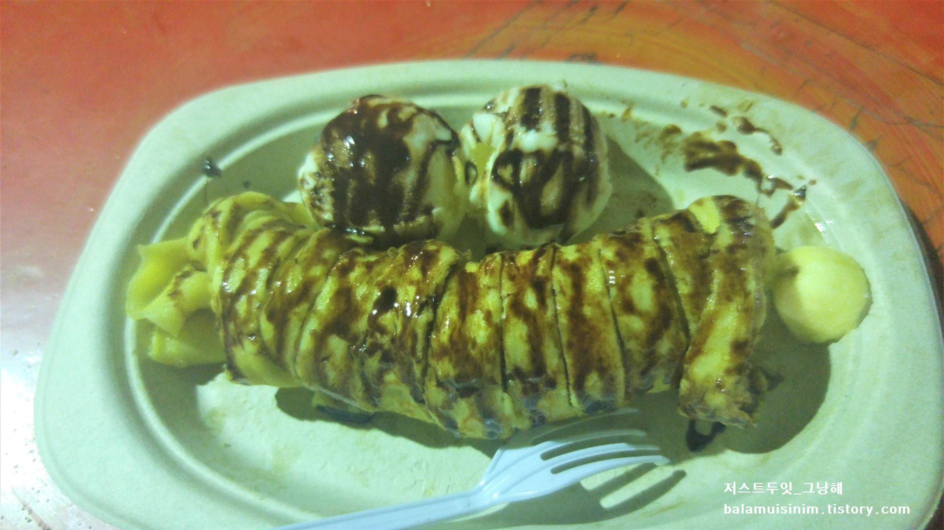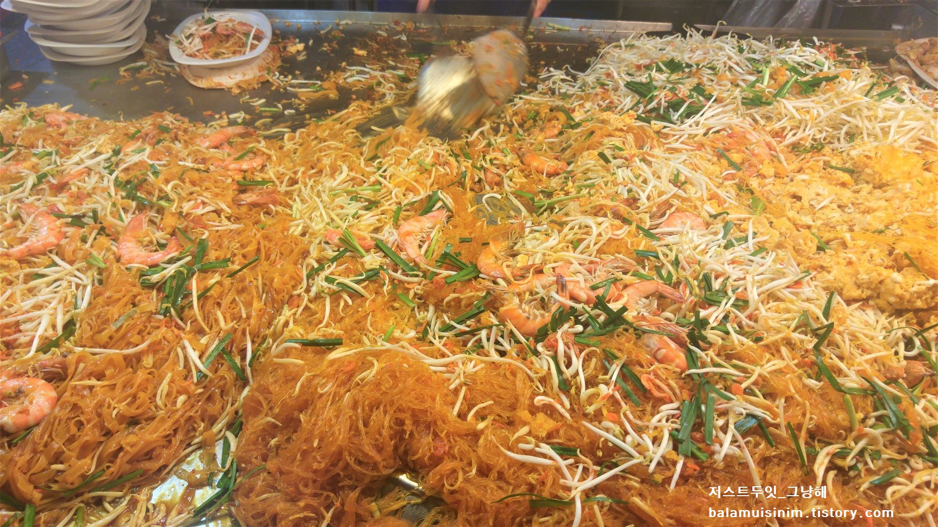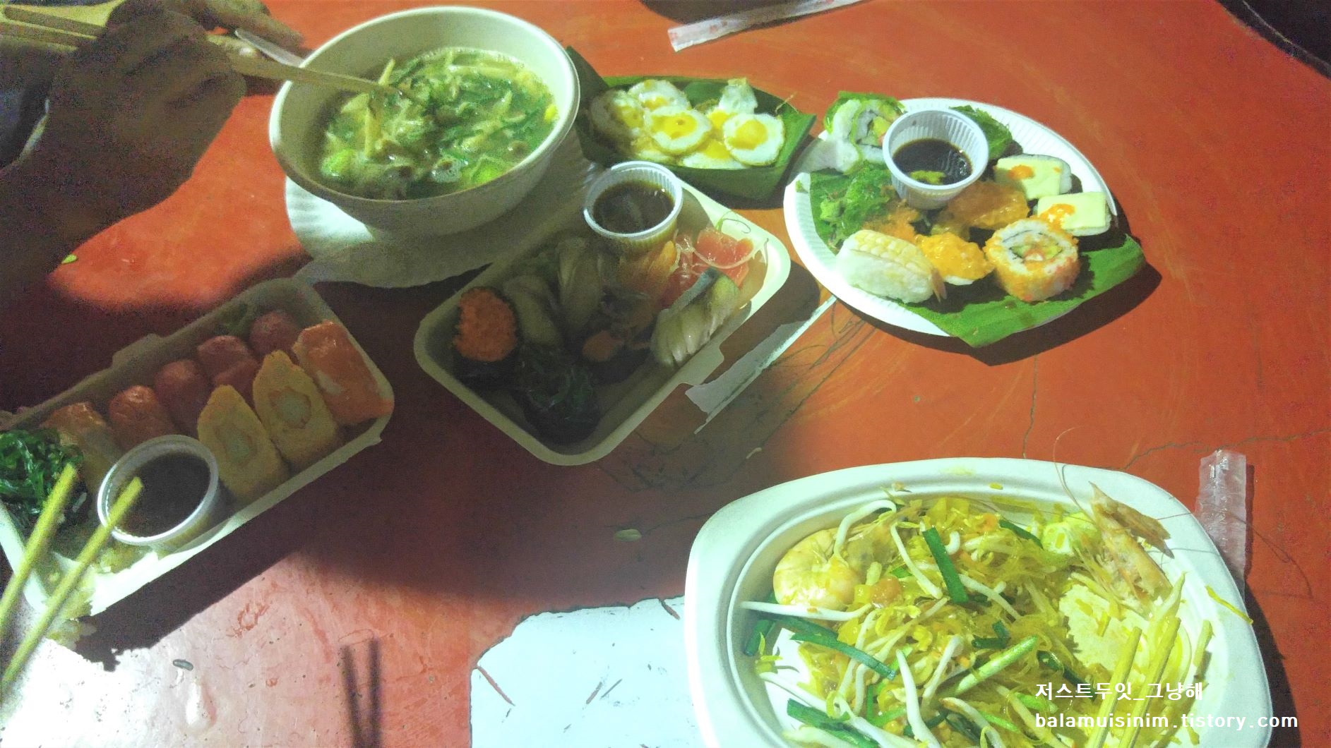 우리는 거대한 철판에 숙주나물을 넣고 볶은 파타이와 각종 초밥과 바나나 케이크 그리고 태국 국수를 사서
