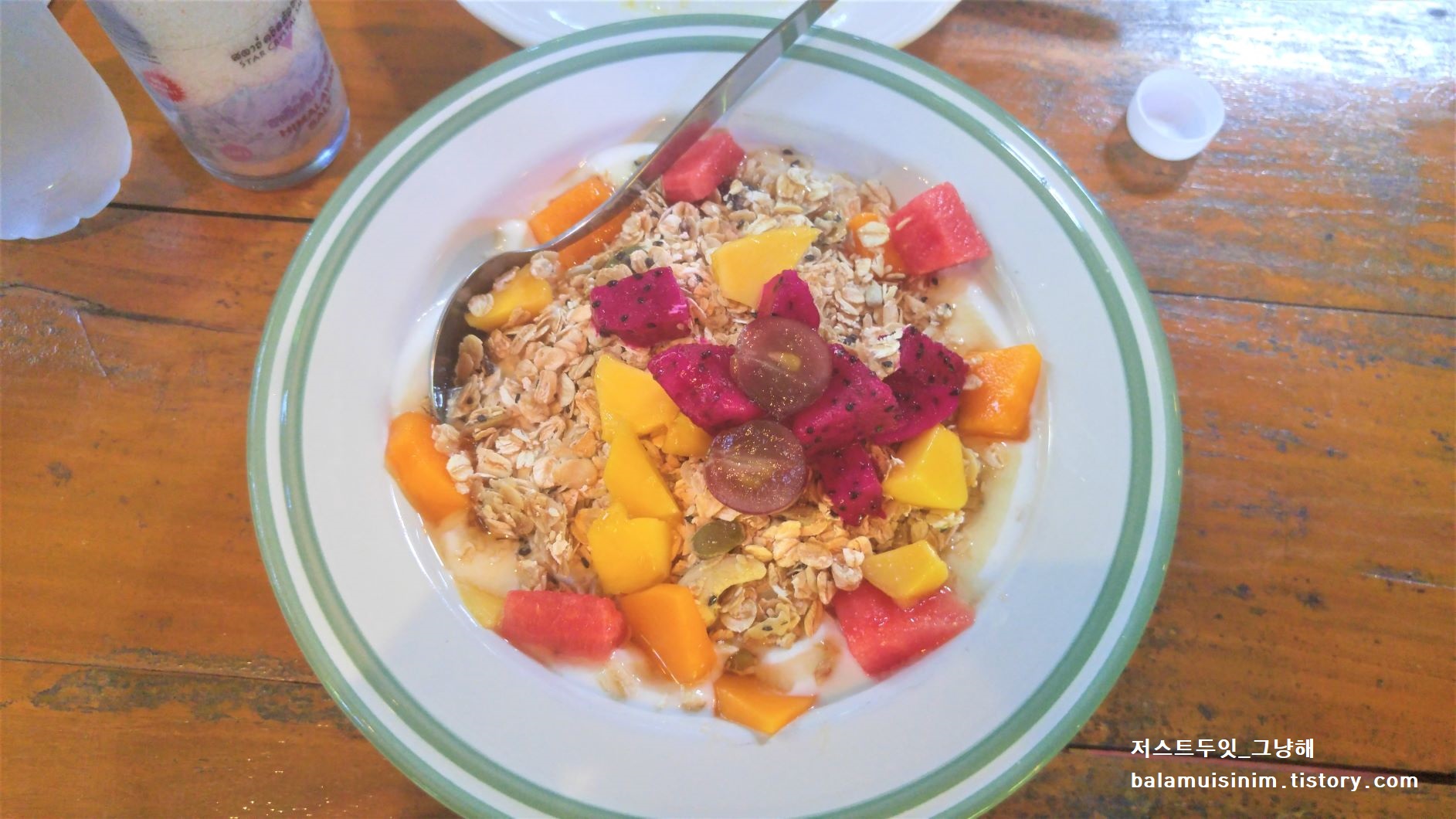 그다음 날엔 과일 샐러드와 오트밀 with과일 요거트를 150바트(5,000원)를 계산했다.