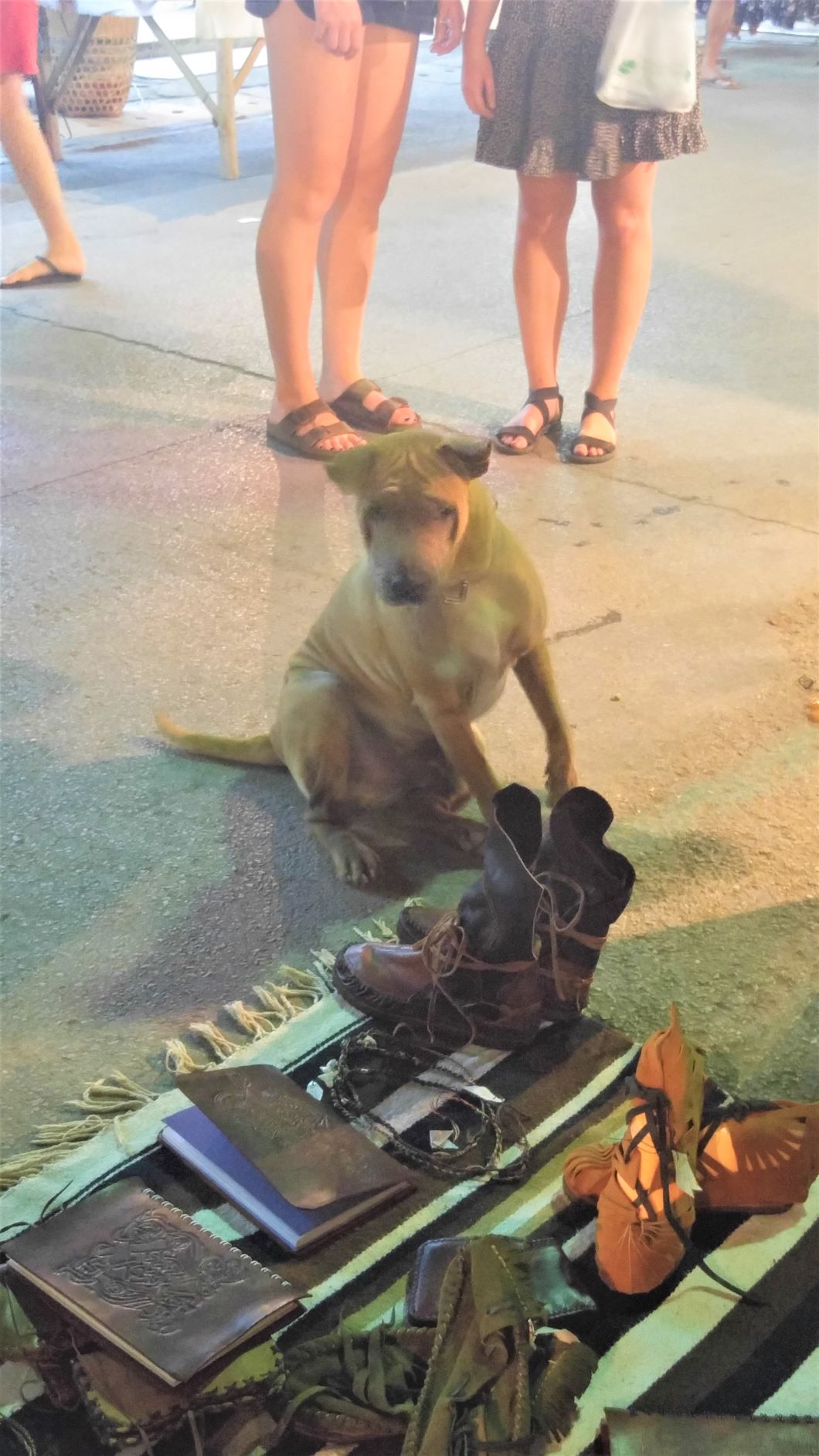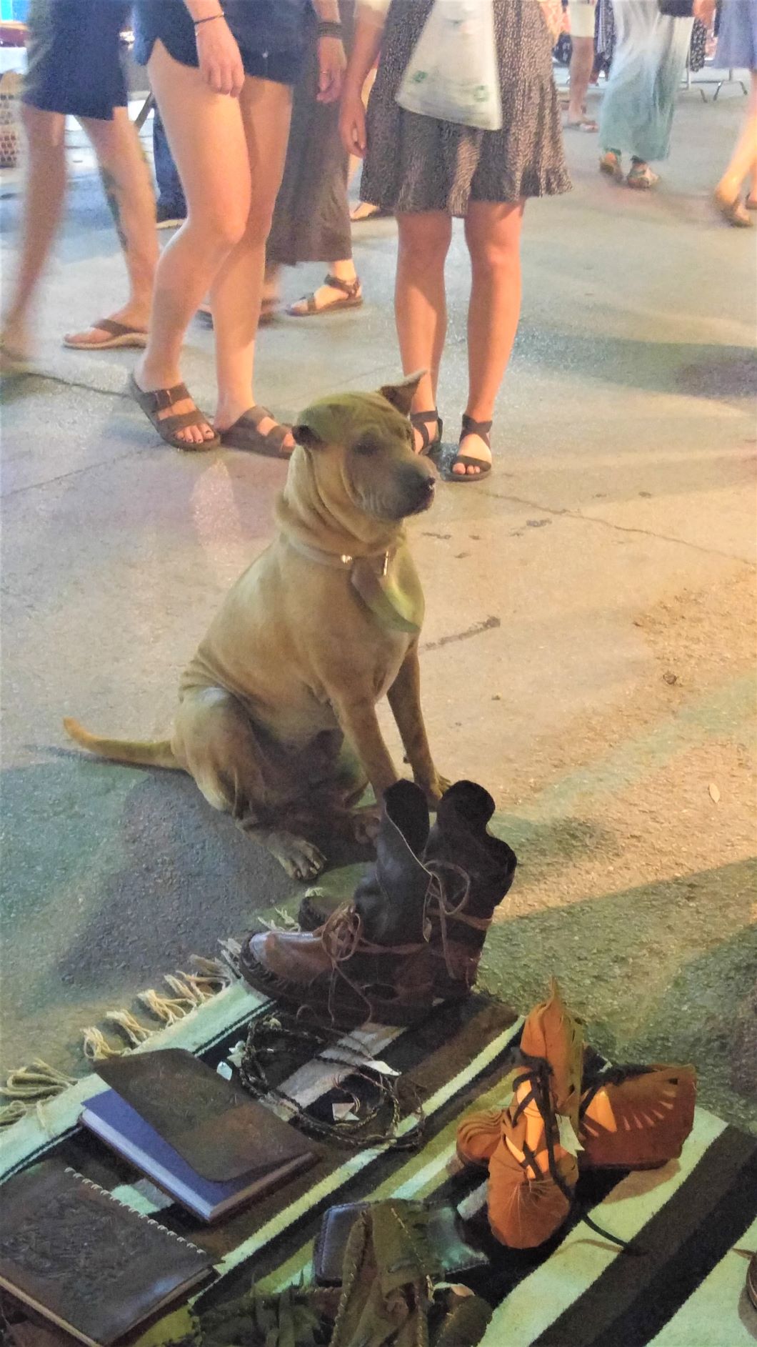 주인과 같이 나온 영리한 개 한 마리~ 손으로 직접 만든 가죽제품을 파는 주인의 물건을 지키기라도 하느냥 늠름하게