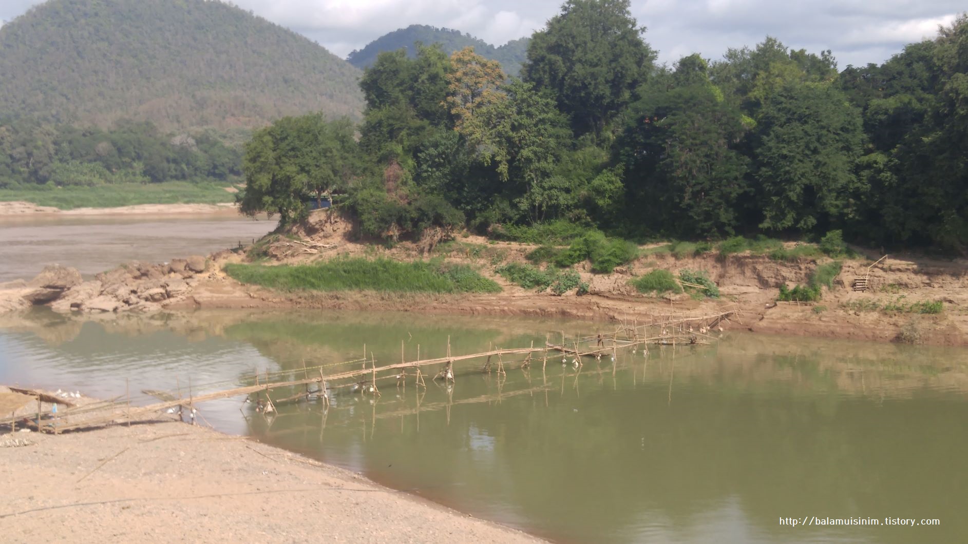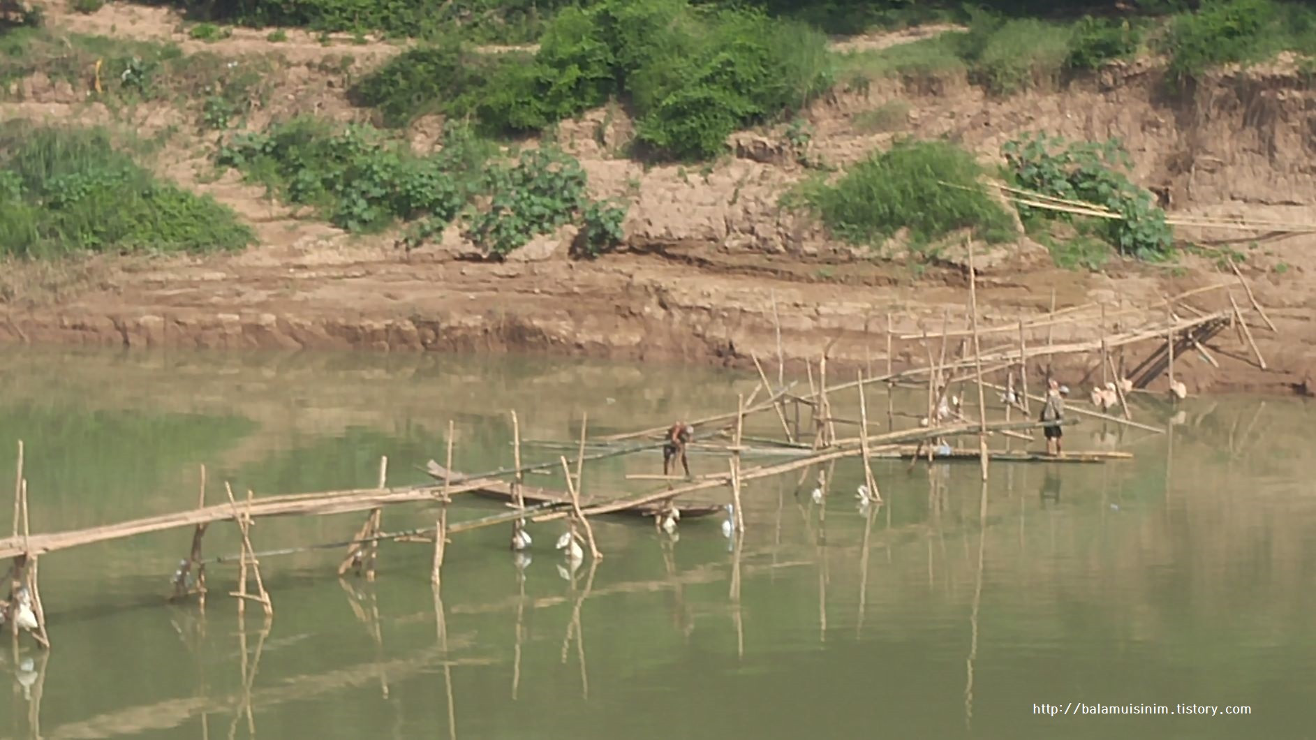 메콩강에 비해 오른쪽으로 흐르는 남칸강은 작은 강으로 겨우 사람만 걸을 수 있는 다리를 사람 두 명이 배 위에 중심을 잡고 나무다리를 만들고 있는 장면이 포착됐다.