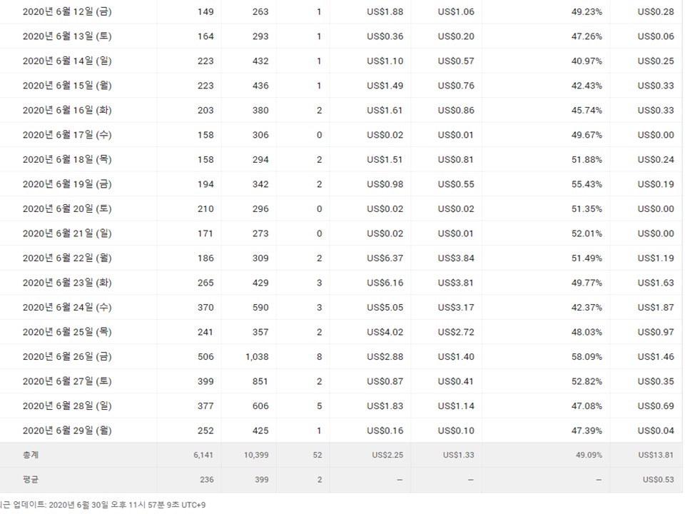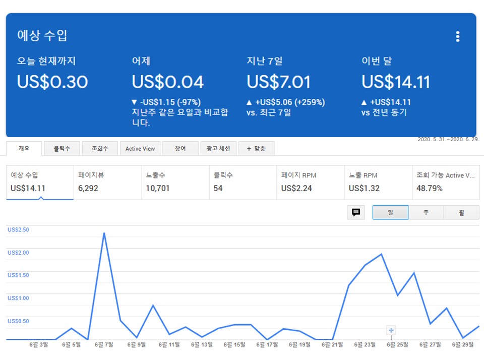 지금까지 광고 수입은 14.11 달러 아직까지는 평균 1일 1달러는 안되는 거 같지만 수입이 들어오는 자체가 너무도 신기하기만 합니다.