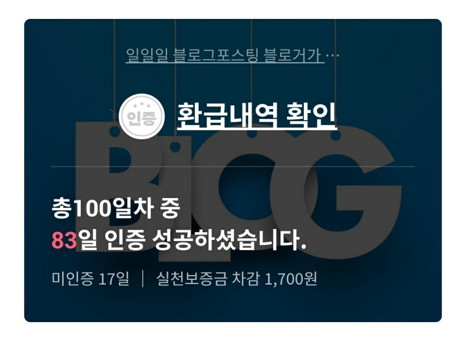오늘 그 결과를 보니 100일 중에 83일을 블로그 83개의 글을 쓰는데 성공을 하였고, 그중에 17일을 인증에 실패했으며..... 거의 59일째 까지는 아주 잘해왔다고 생각이 들지만, 마지막엔 약간은 자포자기 심정으로 빠진 듯합니다.