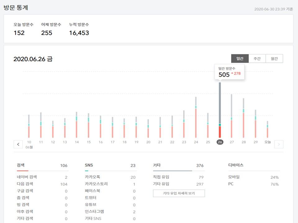 100일 차 누적 방문자수는 16,453으로 평균 1일 164명이 방문을 해주셨고, 1일 방문수가 200이 넘고 300이 넘는 날이 많아지면서 그래프가 요동치는 날이 많지만, 차츰차츰 그래프가 상향하는 걸 볼 수 있습니다.