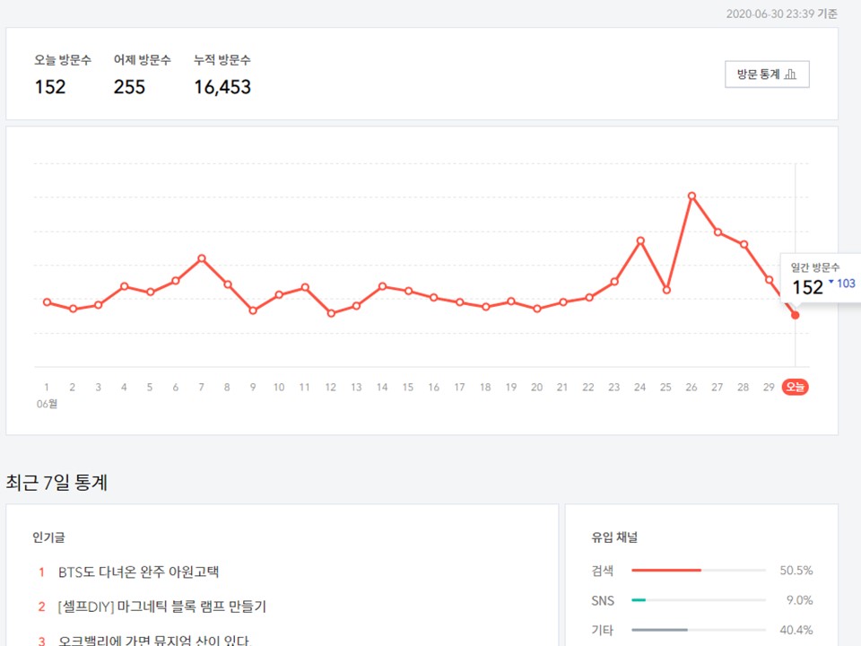 그동안 1일 방문 수중 최고로 많은 조회수가 397이었으며, 6월 26일 [셀프 DIY] 마그네틱 블록 램프 만들기 글을 올린 날은 다음 포털사이트 메인에도 올라가고 조회수가 폭발적으로 올라가 505명의 방문수까지 기록해 100일 중 최고로 높은 수치를 기록한 날입니다.